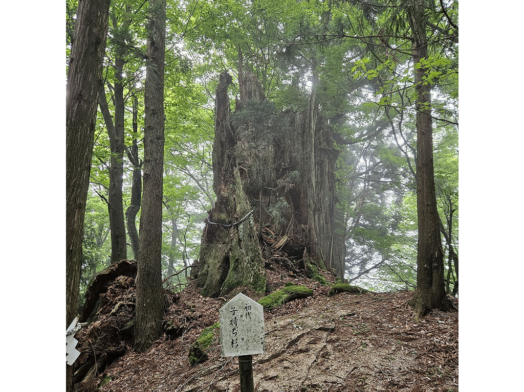 途中、「初代子持ち杉」がありました。台風のため折れてしまったそうですが、折れてもなお巨大な株は参道脇にあり、存在感を醸し出していました。