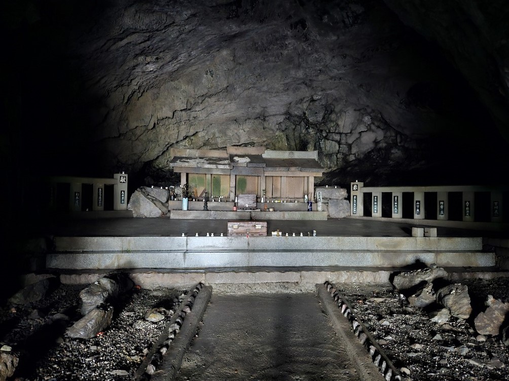 『室戸市には、弘法大師(空海)ゆかりの場所が数多く残っていて、その一つがこの「御厨人窟」で、修行時のご住居として使われていたと伝えられています。 約1200年前の平安時代、青年時代の大師が悟りを開いたといわれる洞窟で、内には五所神社とばれる社があります。 “空海”と名前をつけたのも、ここから見える空と海に感銘を受けたからと言われています。 この横に主に御修行の場として使われていたと伝えられる「神明窟」があります。 なお、「御厨人窟の波音」は環境庁の「日本の音風景100選」に選ばれています。』 室戸市観光協会HPより