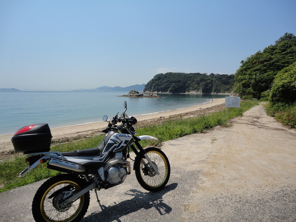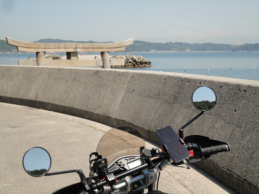 家を出て、国道196号線を通って、杣田を越え、波方ターミナルを横目に宮崎の浜を目指しました。波方町岡からは、適度なコーナリングを楽しみながら走ることができました。海岸に出てしばらく走ると、海の鳥居を見つけました。