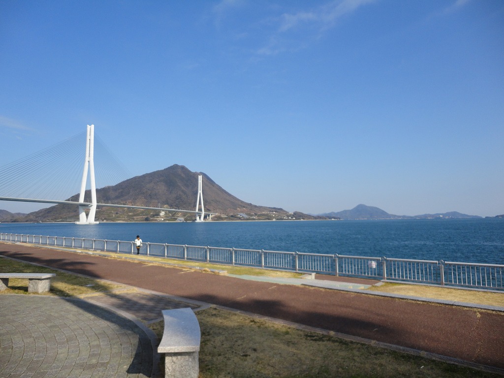 早めに昼食をとって、今治北ICから西瀬戸自動車道に入り、来島海峡大橋、伯方・大島大橋、大三島橋を渡って大三島を目指しました。途中少し風が強かったのですが、なんとか無事大三島ICにたどり着きました。降りて、すぐ「道の駅 多々羅しまなみ公園」に寄り、そこにある「「しあわせの鐘」の前で写真を撮りました。ぐるっと見渡すと、世界有数の斜張橋「多々羅大橋」や「村上三島記念館」を見ることができました。