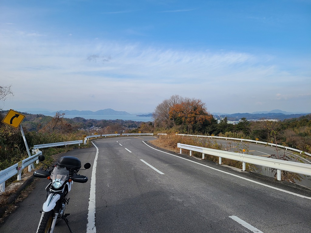 家を出発してから、今治バイパスを通り、「で愛ふれ愛ロード」から県道163号線に入り、途中で振り返って、大西方面のキラキラ輝く青い空と海を眺めて少しほっとしました。この景色は結構気に入っています。